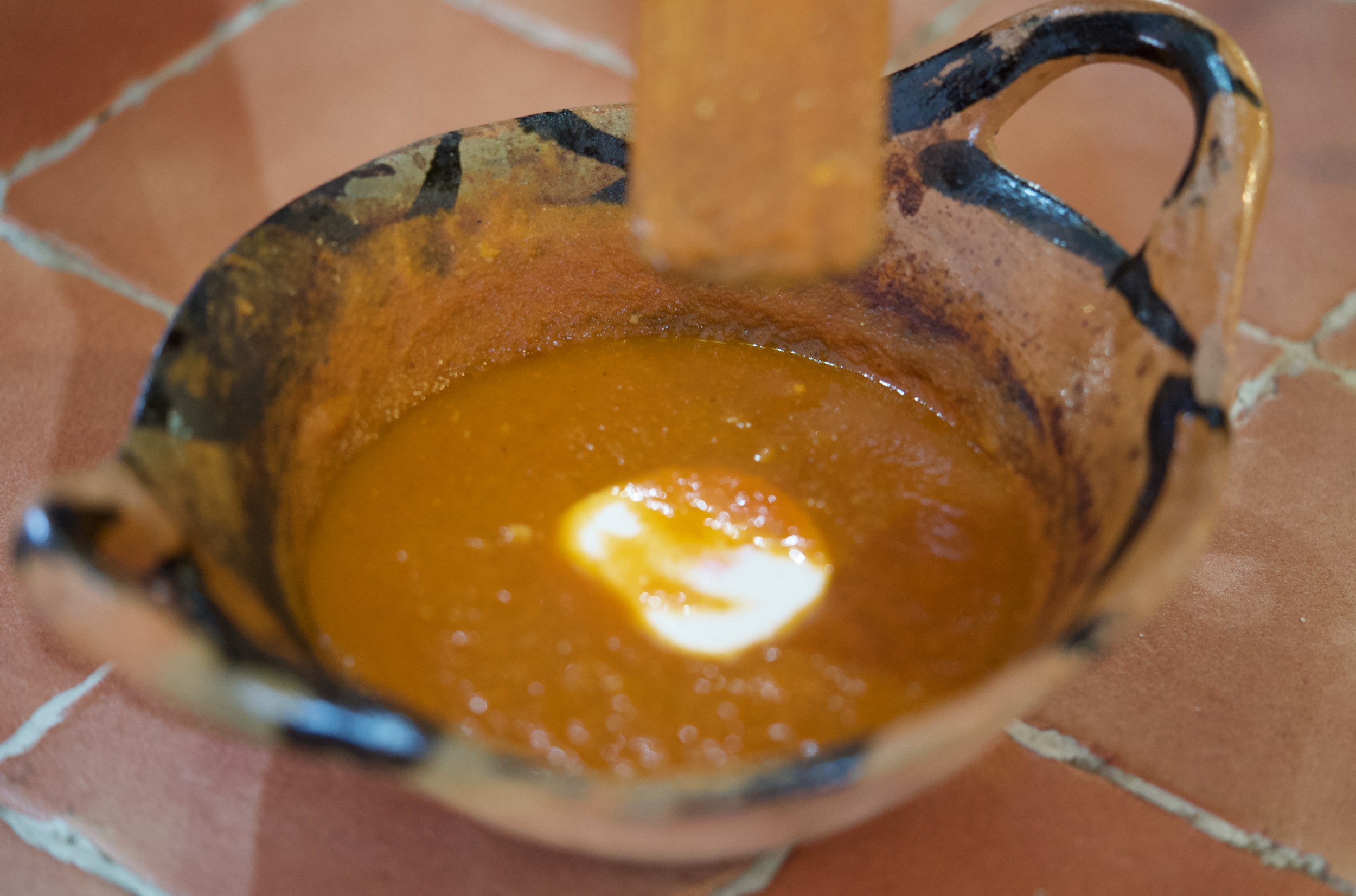 Incorporate the tomato and chile puree and simmer for 10 minutes, stirring often. The color of the tomato will change from a light red orange into a deeper red.
