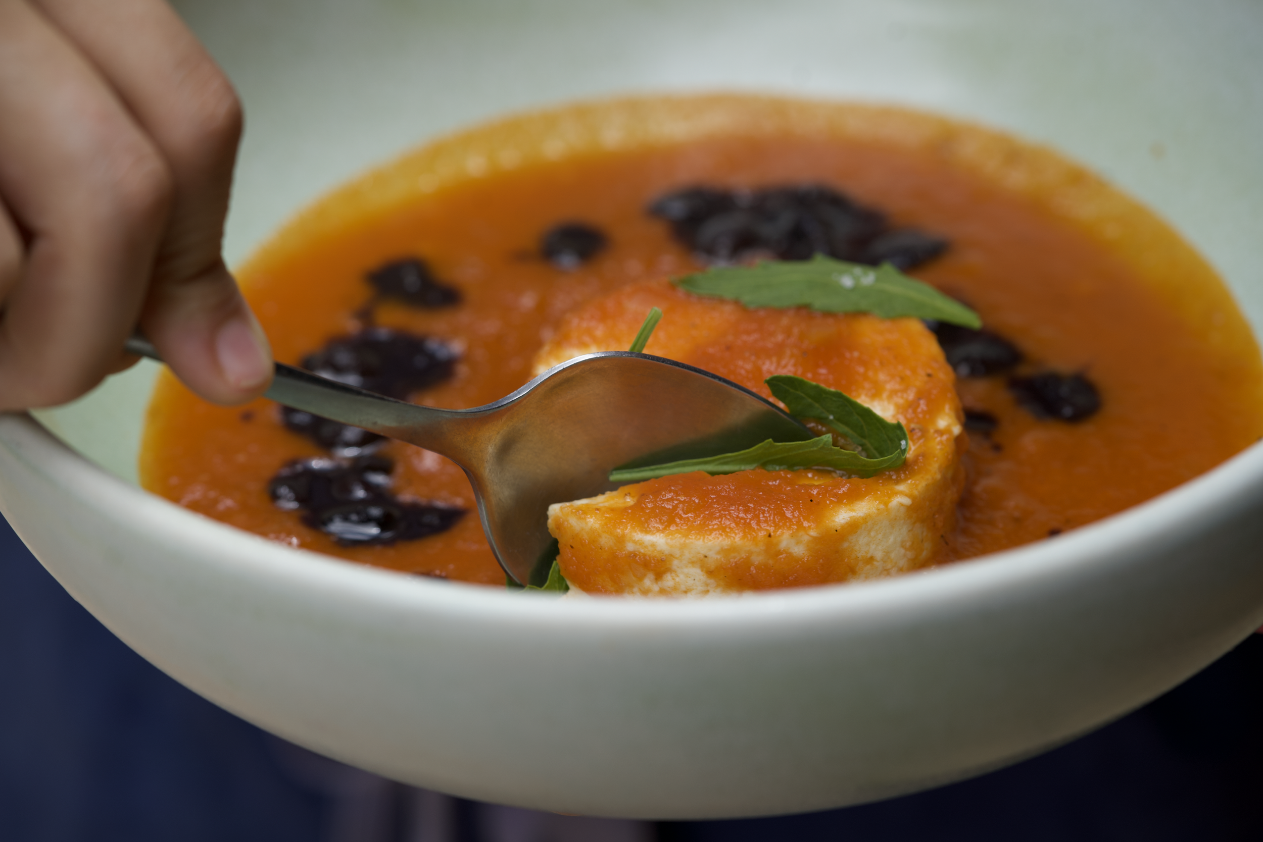 For plating, use the cheese wedges or any shape you desire, submerge it into the tomato puree for a quick 5 minute sauce bath, so that it absorbs into the puree.